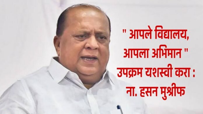 ▪️कोल्हापूर दि ०१ : ” आपले विद्यालय आपला अभिमान ” हा उपक्रम संस्कारक्षम व प्रेरणादायी असून जिल्ह्यातील सर्वच व्यवस्थापनांच्या शाळांनी हा उपक्रम यशस्वी करावा, असे आवाहन राज्याचे वैद्यकीय शिक्षण मंत्री ना.हसन मुश्रीफ यांनी केले.” आपले विद्यालय,आपला अभिमान ” या उपक्रमाच्या संकल्प पत्राचे अनावरण वैद्यकीय शिक्षण मंत्री ना. हसन मुश्रीफ यांच्या हस्ते करण्यात आले. अध्यक्षस्थानी के.डी.सी.सी. संचालक भैय्या माने होते.